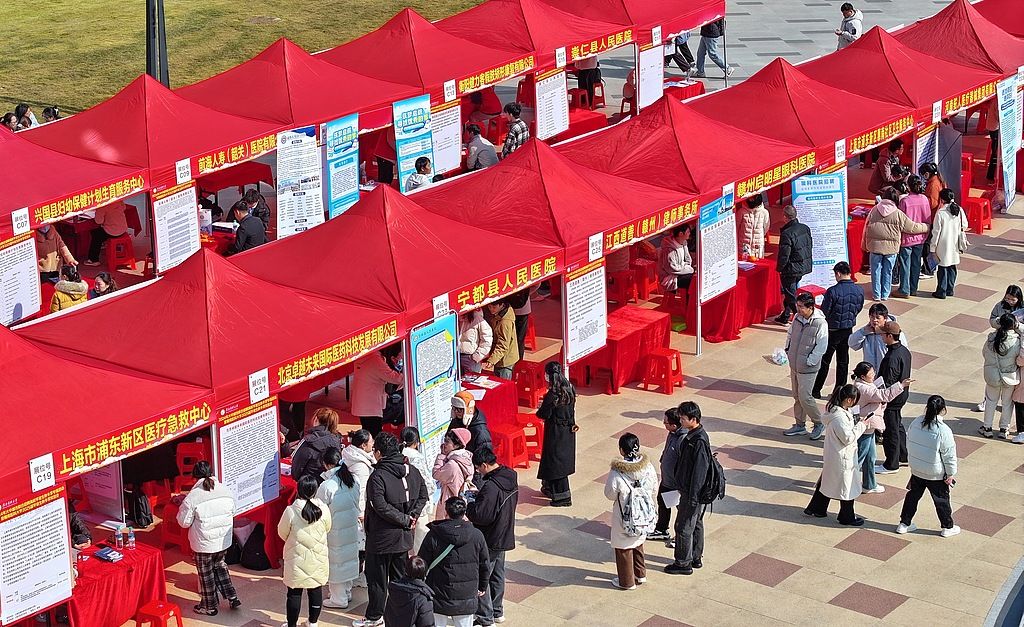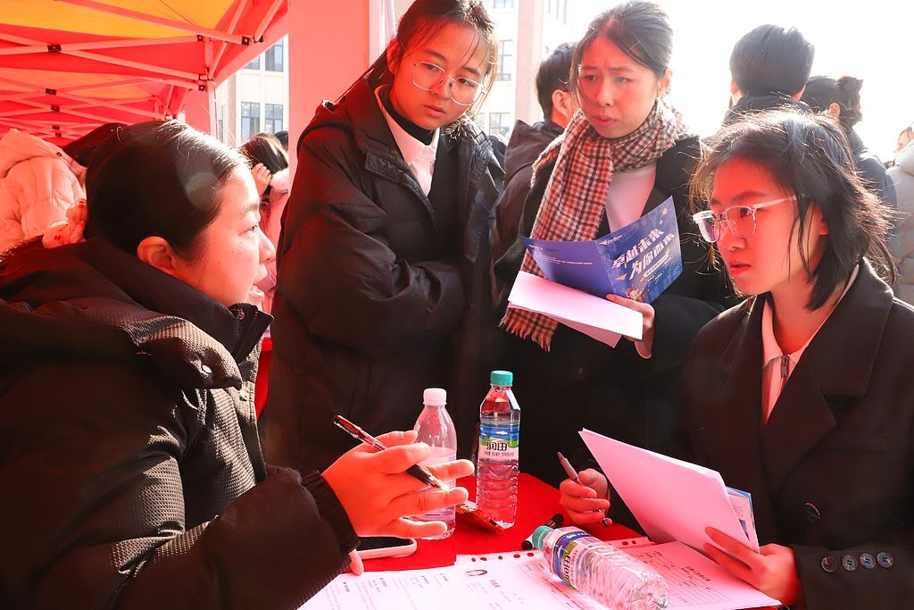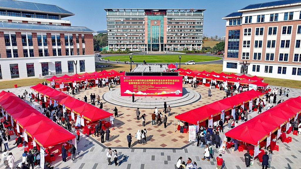 2024年12月24日,江西赣州,赣南医科大学2025届毕业生秋冬季双选会举行,众多毕业生前来咨询、投递简历和应聘岗位。