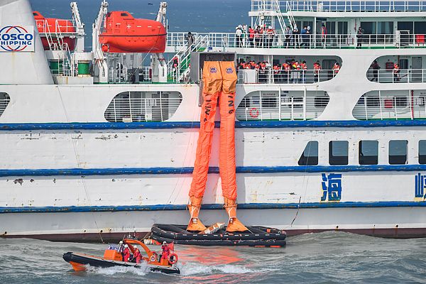 2025年1月7日,在海口秀英港2025年春运琼州海峡海上大规模救助综合演练现场,空中廊桥救援船转移受困人员。