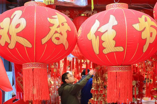 2025年1月7日,南京,市民在一家小商品市场选购春联、福字、红灯笼等春节饰品。
