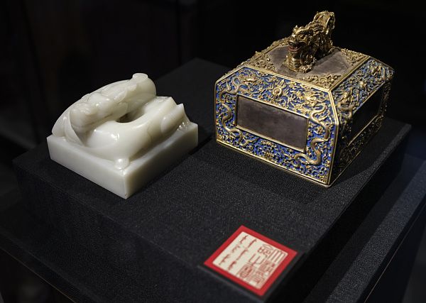 2025年1月7日,北京,在故宫斋宫展厅,“玉出昆冈——清代宫廷和田玉文化特展”,白玉盘龙钮“大清受命之宝”。此宝为乾隆皇帝钦定二十五宝之首。