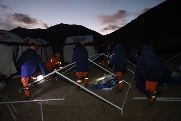 2025年1月7日,西藏森林消防总队的救援人员搭建帐篷。