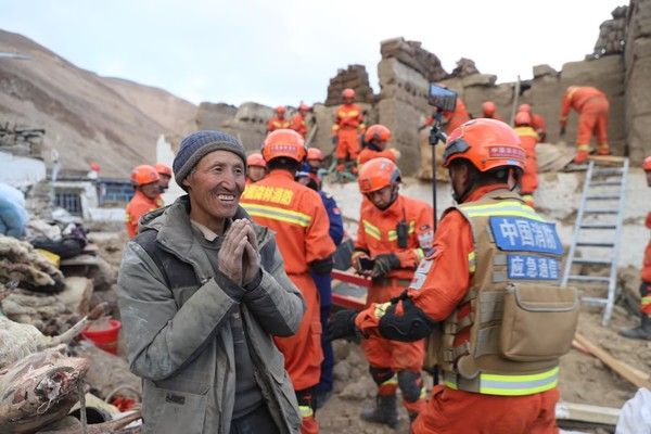 2025年1月7日,西藏日喀则,村民的房屋倒塌,生活物资和牦牛都被埋在废墟中,森林消防指战员将他的三头牦牛和生活物资转运出来,村民对此十分感动。