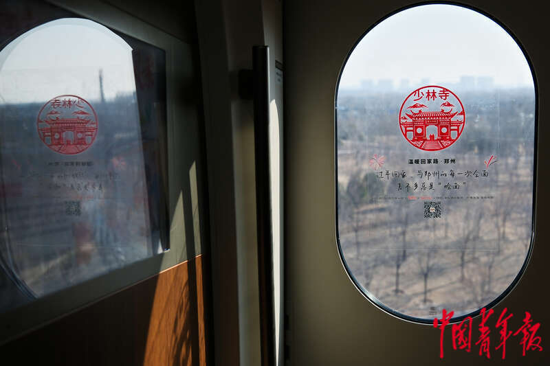 1月13日,从北京开往南昌的G893次列车上,一幅窗花上描绘着少林寺的图案。本次列车有北京、石家庄、郑州、武汉、庐山、南昌6个停靠站,列车员们提前布置了融入了沿途各站文化、美食、景点等特色元素的窗花,让高铁充满了“年味儿”,希望每一位旅客都能在窗花上找到自己的家乡。中青报·中青网记者 田嘉硕/摄