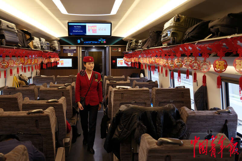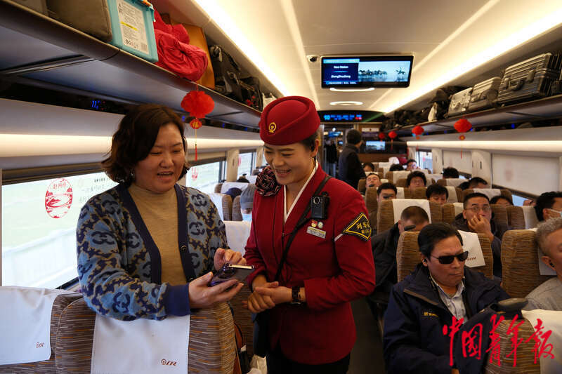 1月13日,从北京开往南昌的G893次列车上,列车长欧阳一君(右)正在帮助一名乘客解决换乘问题。为期40天的2025年春运即将拉开帷幕,本次春运是欧阳一君服务的第12个春运,她直言“群众的假期就是我的高峰期”,12年来,欧阳一君一如既往地服务好列车上的每一名乘客,在即将到来的2025年春运,她希望能像往常一样,为更多乘客带来温暖和帮助,让他们都能平安顺利地抵达家乡,过个好年。中青报·中青网记者 田嘉硕/摄