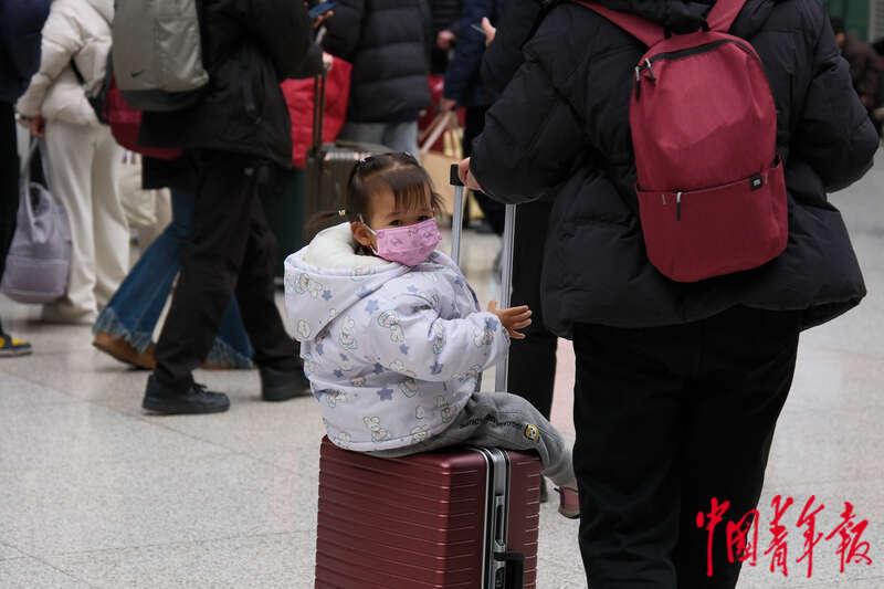 1月13日,铁路郑州东站,坐在行李箱上的孩子。中青报·中青网记者 田嘉硕/摄