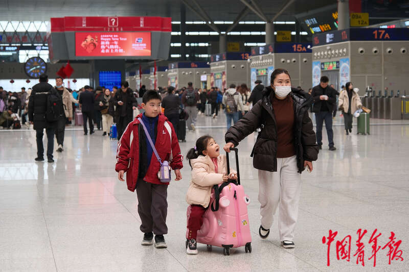 1月13日,铁路郑州东站,一家人在候车大厅内行走。中青报·中青网记者 田嘉硕/摄