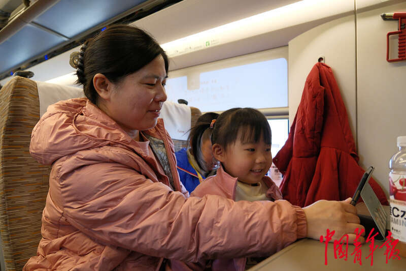 1月13日,从北京开往南昌的G893次列车上,黄女士和女儿一起看视频。中青报·中青网记者 田嘉硕/摄