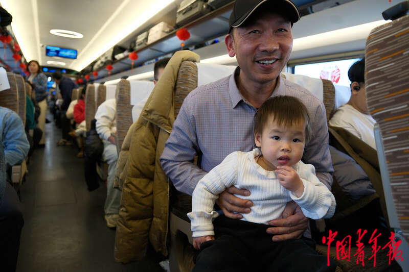 1月13日,从北京开往南昌的G893次列车上,一名乘客抱着小朋友回家过年。中青报·中青网记者 田嘉硕/摄