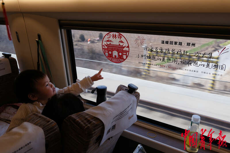 1月13日,从北京开往南昌的G893次列车上,一名小朋友被高铁玻璃上的窗花吸引。此行,姥姥带着她回南昌的老家过年。中青报·中青网记者 田嘉硕/摄