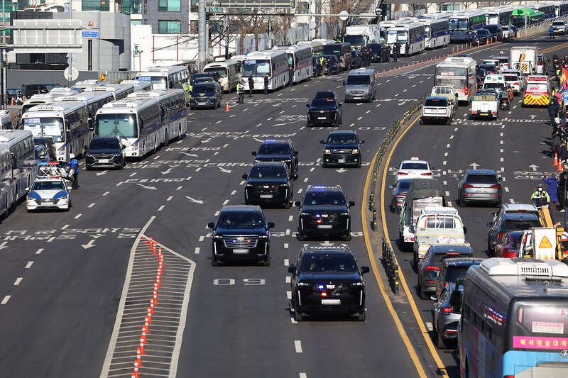 1月15日,韩国首尔,载有尹锡悦的车队正从位于龙山区汉南洞的总统官邸,驶向果川特别调查委员会。图片来源 视觉中国