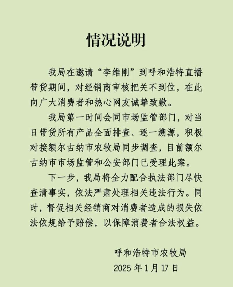 呼和浩特市农牧局1月17日发布情况说明称,该局在邀请“李维刚”到呼和浩特直播带货期间,对经销商审核把关不到位,在此向广大消费者和热心网友诚挚致歉。