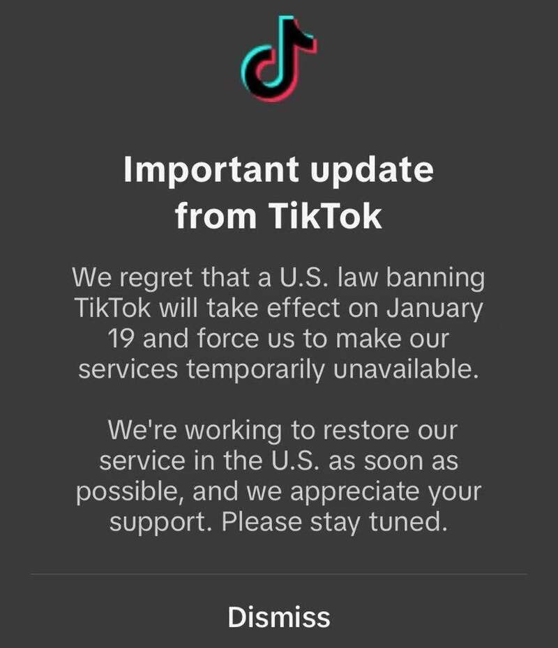 弹窗大意为,“很遗憾地通知各位,美国禁止TikTok的禁令将于1月19日生效,迫使我们暂时无法使用我们的服务。我们正在努力尽快恢复在美国的服务。感谢您的支持,敬请期待。”