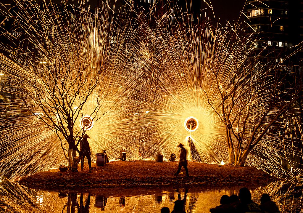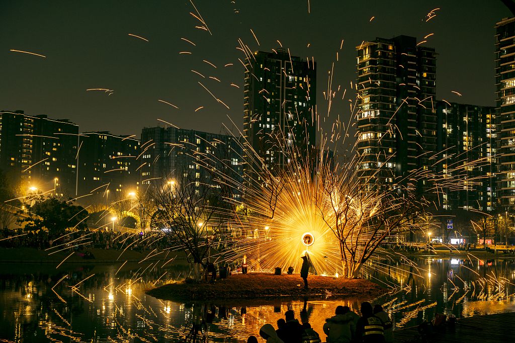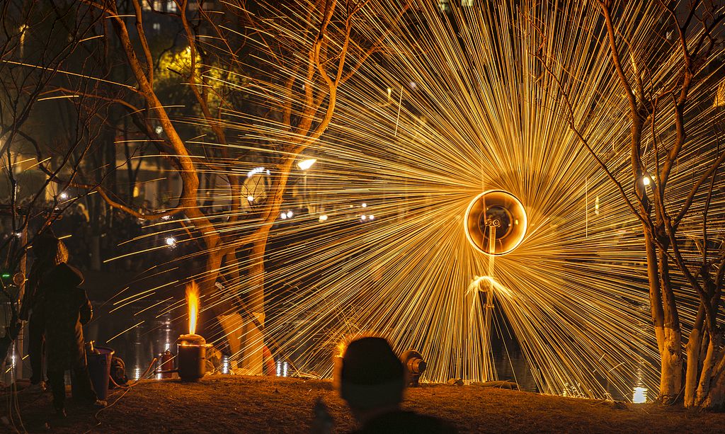 杭州亚运公园非遗打铁花表演 “火树银花”迎新春
