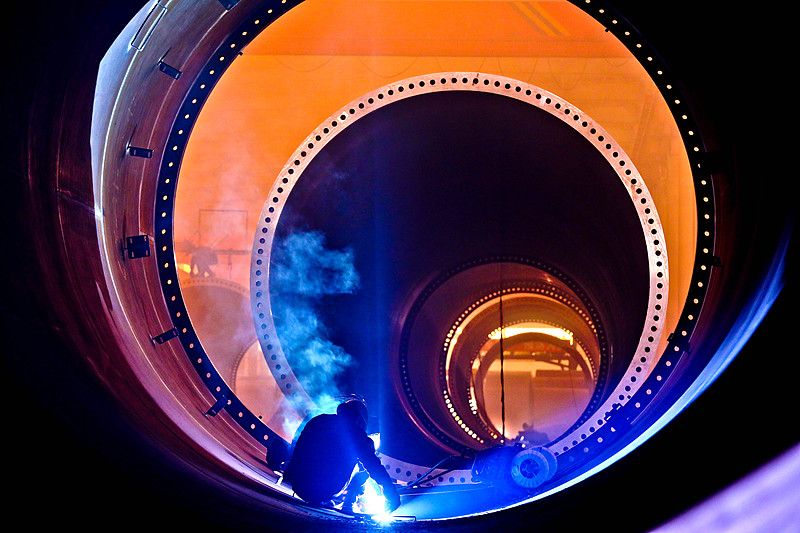 2025年2月19日,甘肃张掖,位于高台县南华工业园的甘肃创腾电力装备公司风电塔筒生产线上,机器轰鸣、焊花飞溅,工作人员正在紧张忙碌的进行风电塔筒单节内焊接。
