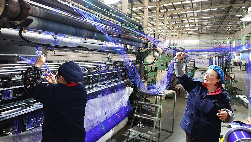 2025年2月20日,江苏连云港高新区海州工业园内,一家民营企业的工人正在加紧生产一批网具订单产品。