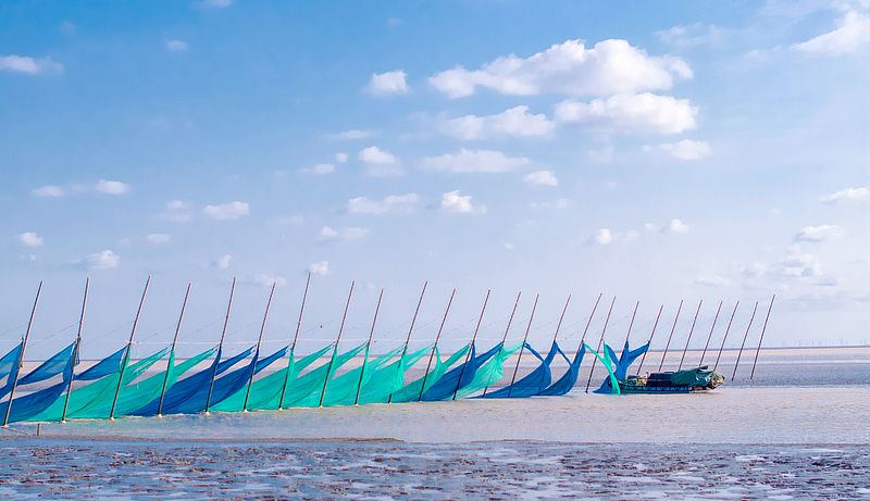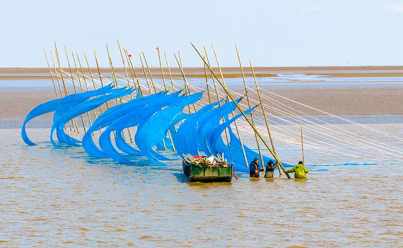 2025年2月20日,江苏省盐城市东台条子泥海滨,渔民支网捕捞鳗鱼苗。(无人机照片)
