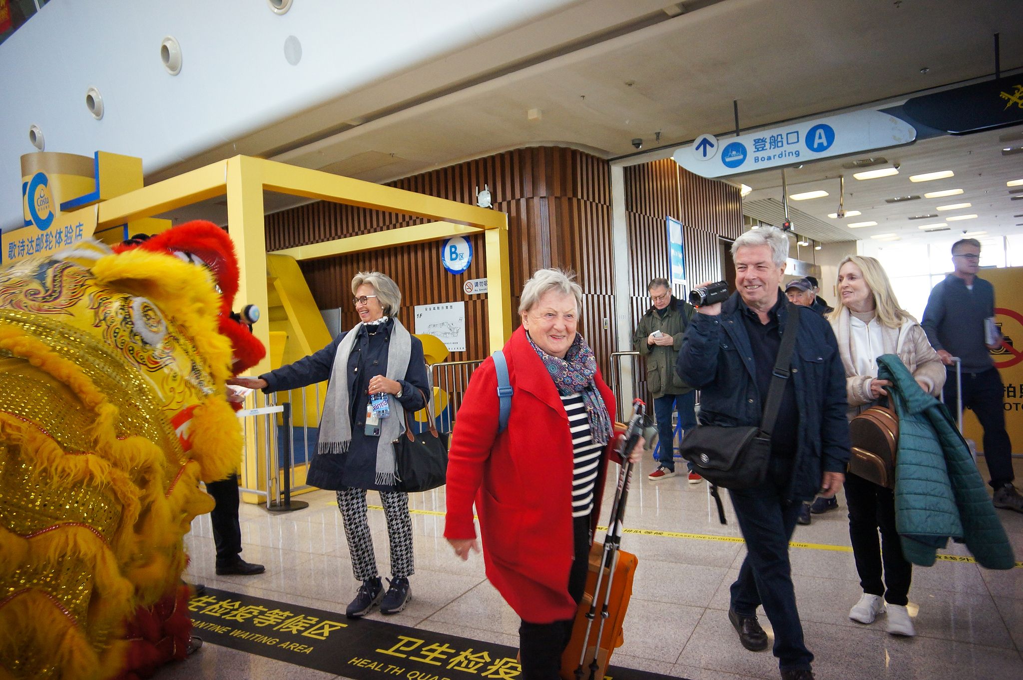 2025年2月25日凌晨,“欧罗巴2”号(EUROPA2)邮轮靠泊天津国际邮轮母港,这是天津口岸2025年迎来的首艘访问港邮轮。该轮系环球航线邮轮,共搭载来自德国、澳大利亚、奥地利等15个国家和地区的400余名旅客。该轮从越南下龙湾来华后,已先后访问了厦门和上海,本次预计在天津停泊两天一夜,停泊期间,旅客与船员将离船前往北京和天津游览。图为国际旅客在天津国际邮轮母港与中国舞狮演员互动。 中新社记者 佟郁 摄