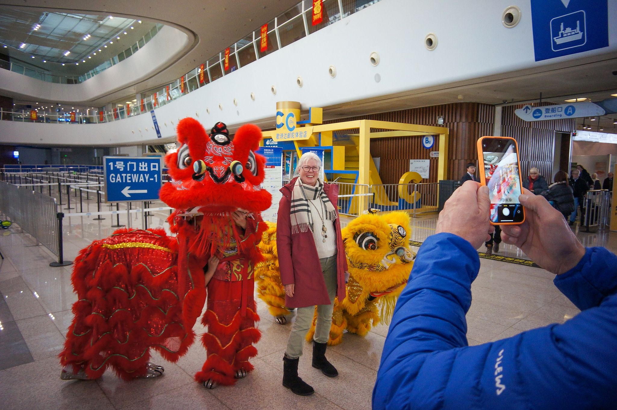 2025年2月25日凌晨,“欧罗巴2”号(EUROPA2)邮轮靠泊天津国际邮轮母港,这是天津口岸2025年迎来的首艘访问港邮轮。该轮系环球航线邮轮,共搭载来自德国、澳大利亚、奥地利等15个国家和地区的400余名旅客。该轮从越南下龙湾来华后,已先后访问了厦门和上海,本次预计在天津停泊两天一夜,停泊期间,旅客与船员将离船前往北京和天津游览。图为国际旅客在天津国际邮轮母港与中国舞狮演员合影。 中新社记者 佟郁 摄