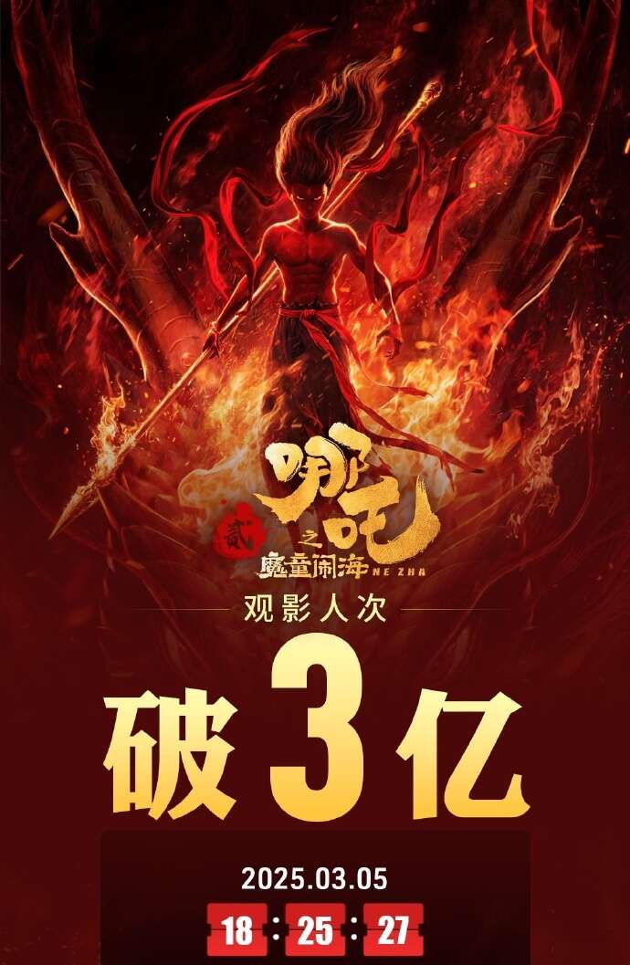 中国影史首部!《哪吒2》观影人次破3亿