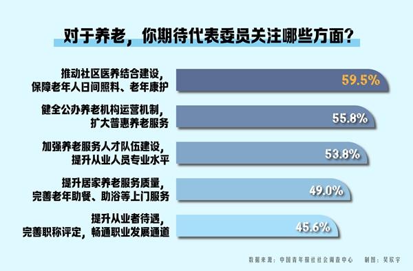今年全国两会,“养老”成为许多代表委员热议的话题。近日,中国青年报社社会调查中心联合问卷网(wenjuan.com)进行的一项有2009名受访者参与的调查显示,59.5%的受访者期待推动社区医养结合建设,保障老年人日间照料、康复护理。57.9%的受访者认为青年可以投身智慧养老平台的建设和运营。