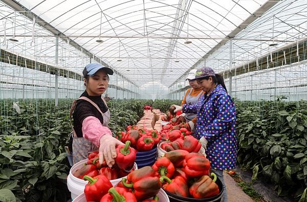 2025年3月10日,在广西柳州市融安县长安镇蔬菜产业园,农民正在温室大棚里劳作。近年来,广西柳州市融安县立足城郊融合型乡村优势,加快推进高标准温室大棚建设,采取“公司+合作社+农户”运营模式,打造集瓜菜生产、仓储物流、游玩采摘等功能为一体的农业产业园区发展特色蔬菜产业,带动农民增收致富,助力乡村振兴。