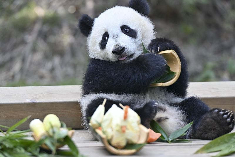 2025年3月11日,广东广州,大熊猫幼崽“妹猪”享用特制“入伙宴”。当日,即将满9个月大的大熊猫幼崽“妹猪”(昵称)在升级改造后的长隆野生动物世界大熊猫中心亮相。经升级改造,该中心集合“妹猪”室内外展示、大熊猫科普教育等内容,让游客了解大熊猫的生活习性、保护现状以及保护大熊猫的重要意义。 中新社记者 陈骥旻 摄