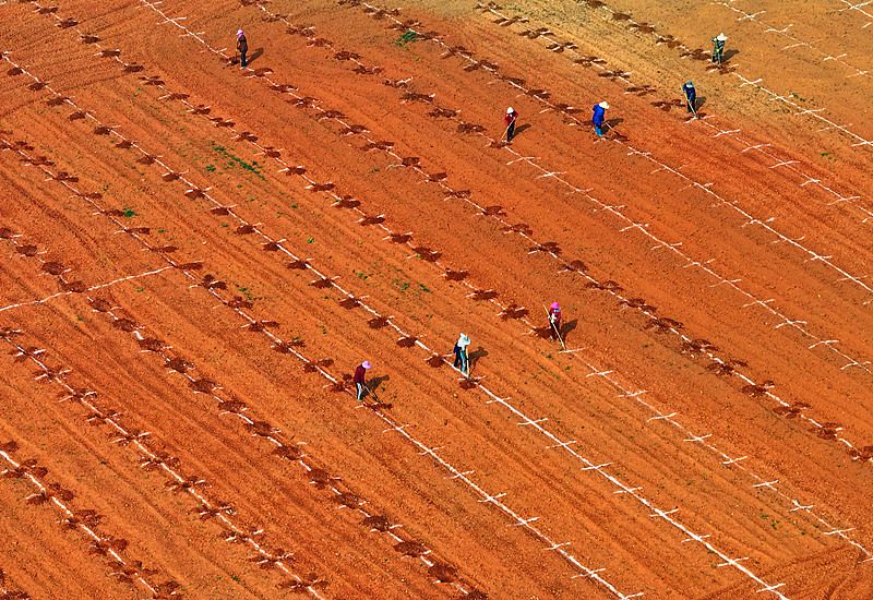 2025年3月12日,江西省吉安市泰和县塘洲镇樟溪村,农民正在田间挖穴,准备种植果树。