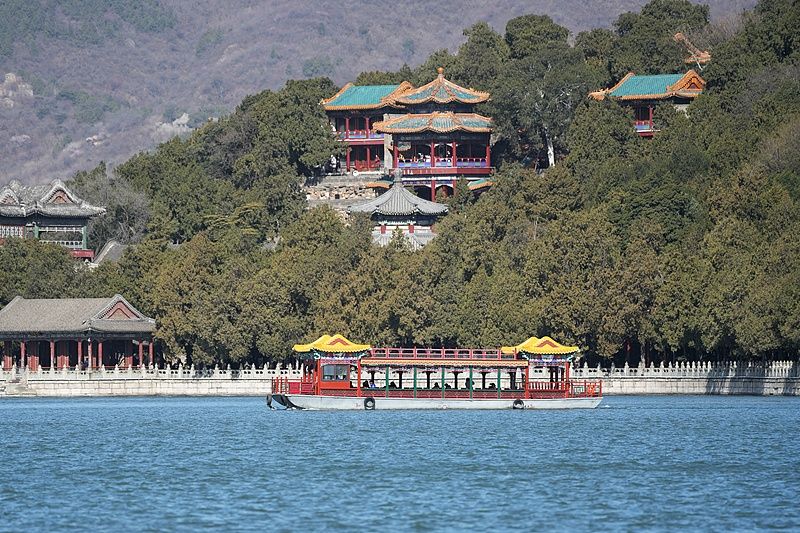 2025年3月12日,北京颐和园,航行于昆明湖上的游船与画中游同框。当日,颐和园等北京5家市属公园游船开航。 中新社记者 张祥毅 摄