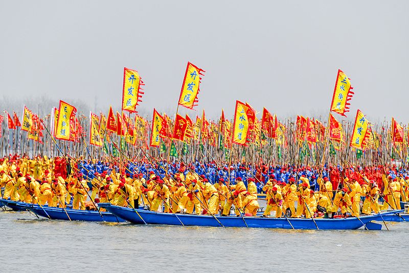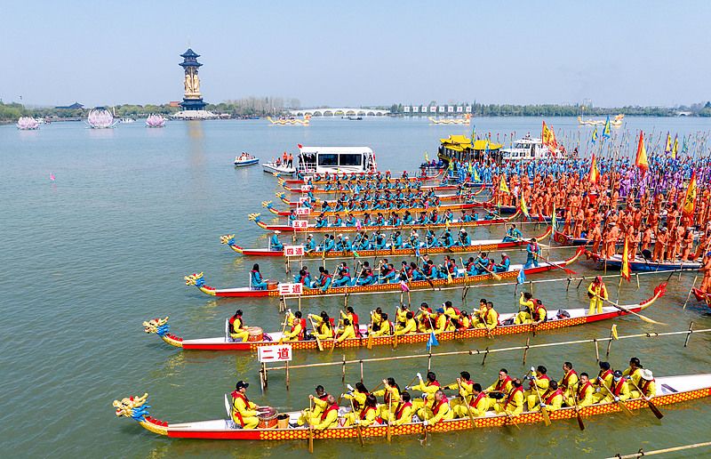 2025年4月6日,江苏泰州,选手们参加溱潼会船表演。