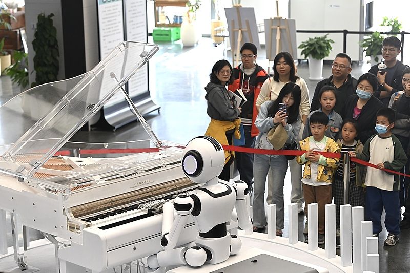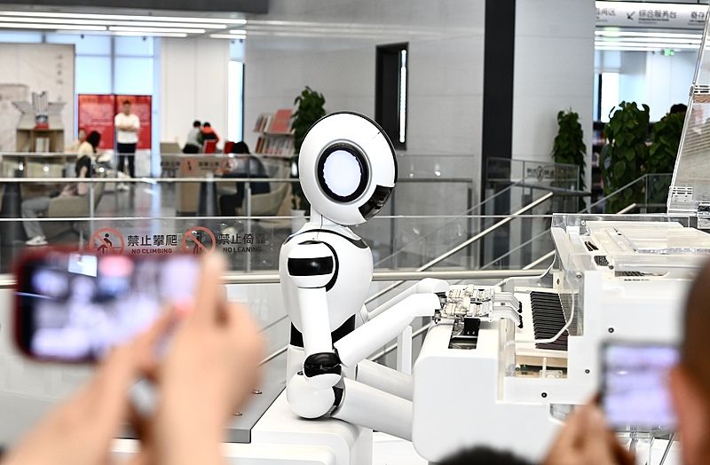 2025年4月6日,在安徽省合肥市中心图书馆,读者被演奏钢琴曲的机器人吸引。