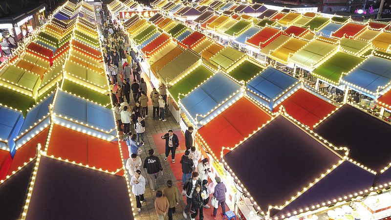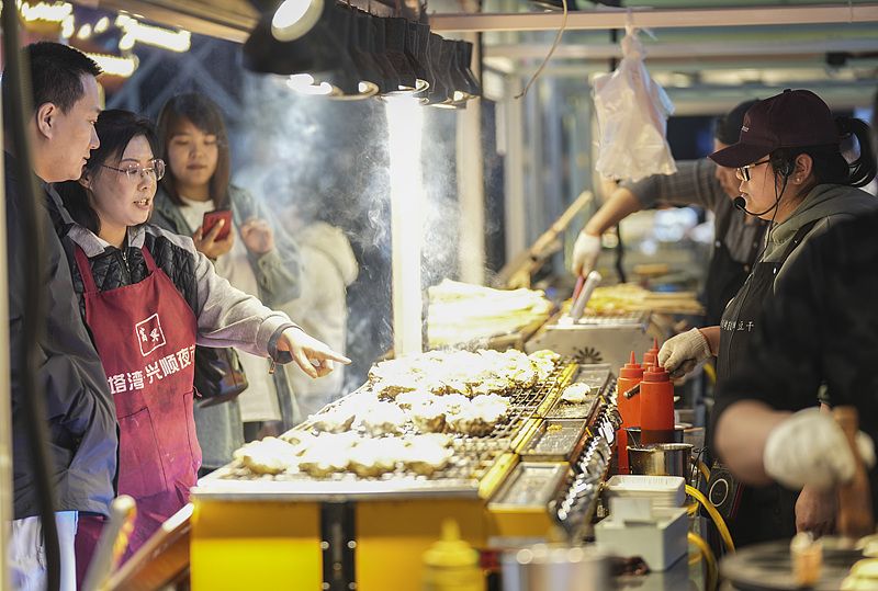 2025年4月8日,辽宁省沈阳市,人们在皇姑区塔湾兴顺国际夜市品尝美食。