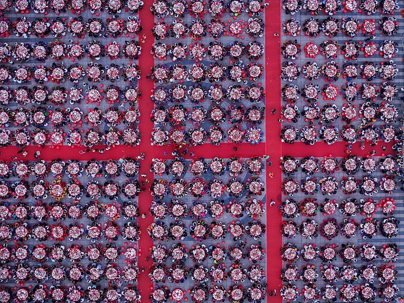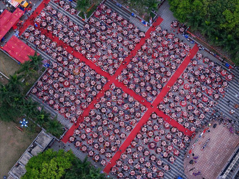 2025年4月9日,广西壮族自治区南宁市邕宁区蒲庙镇,在2025年蒲庙花婆节百家宴现场,3700多名居民在广场上同时吃丰盛的坝坝宴宴席,庆祝花婆节。