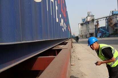 4月16日,北京铁路物流中心琉璃河营业网点专用线工作人员在检查集装箱是否安装到位。高庆彪/摄