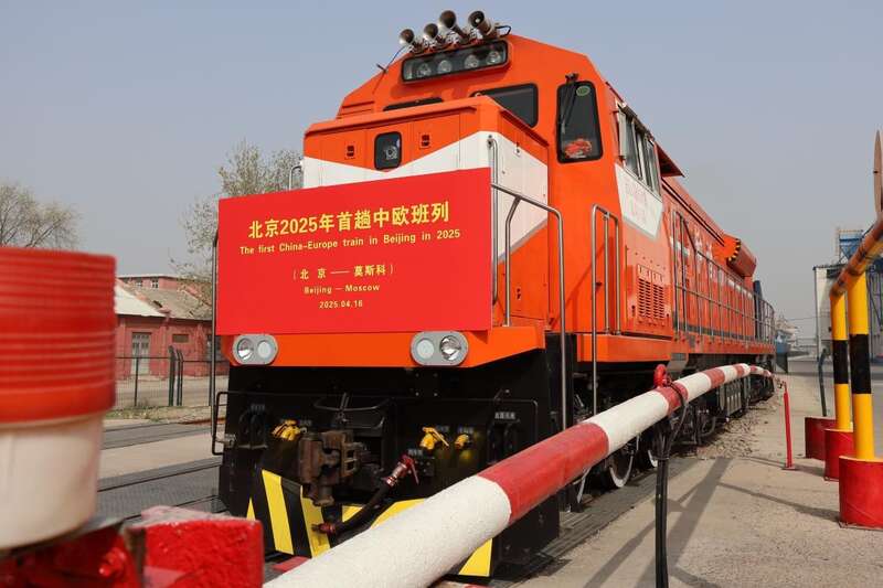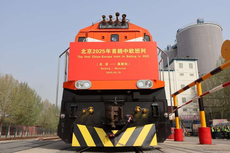 4月16日,2025年北京地区首趟中欧班列在北京铁路物流中心琉璃河营业网点专用线整装待发。高庆彪/摄