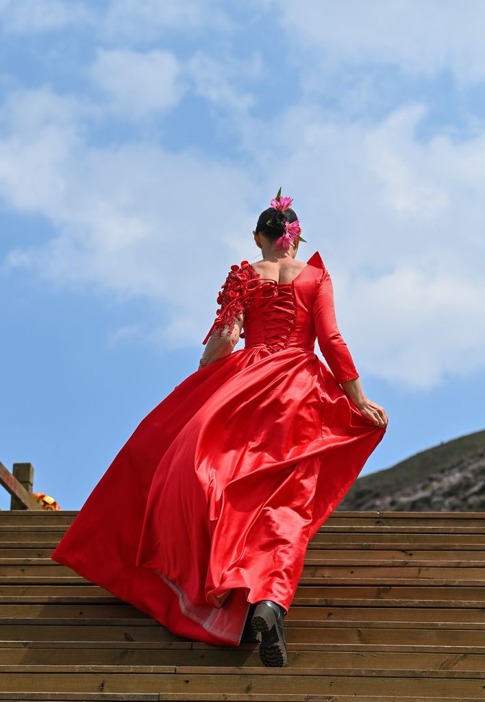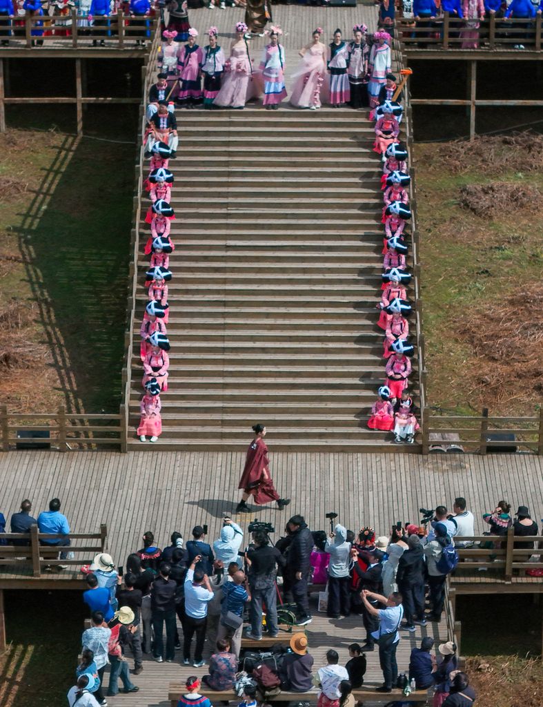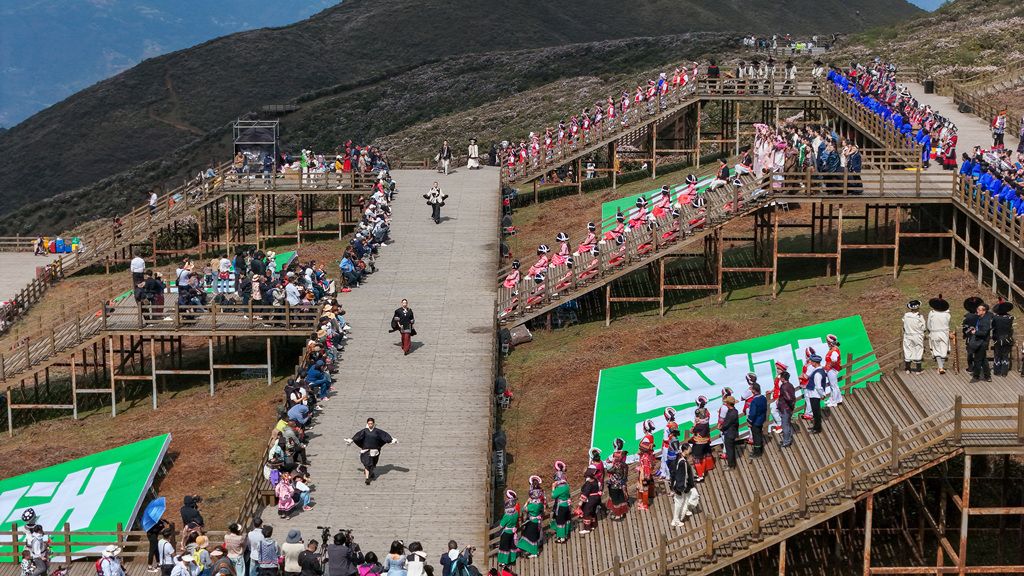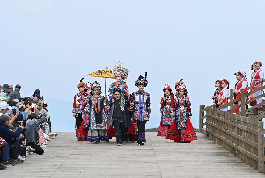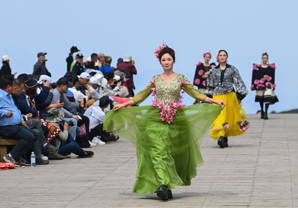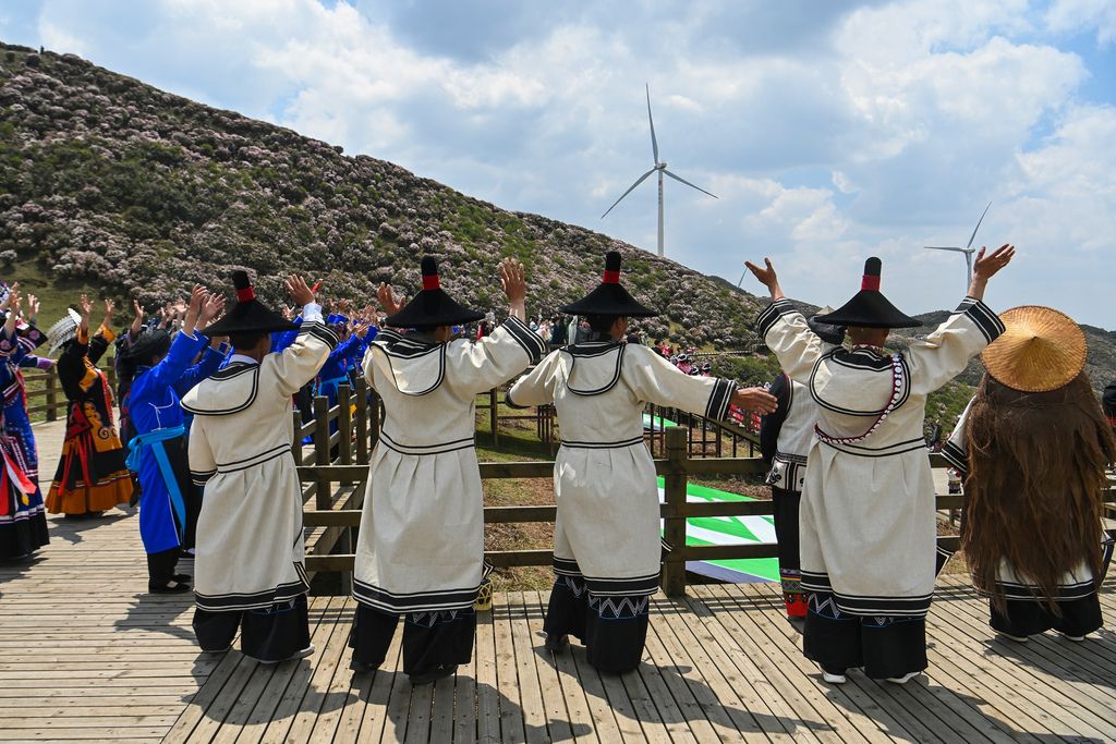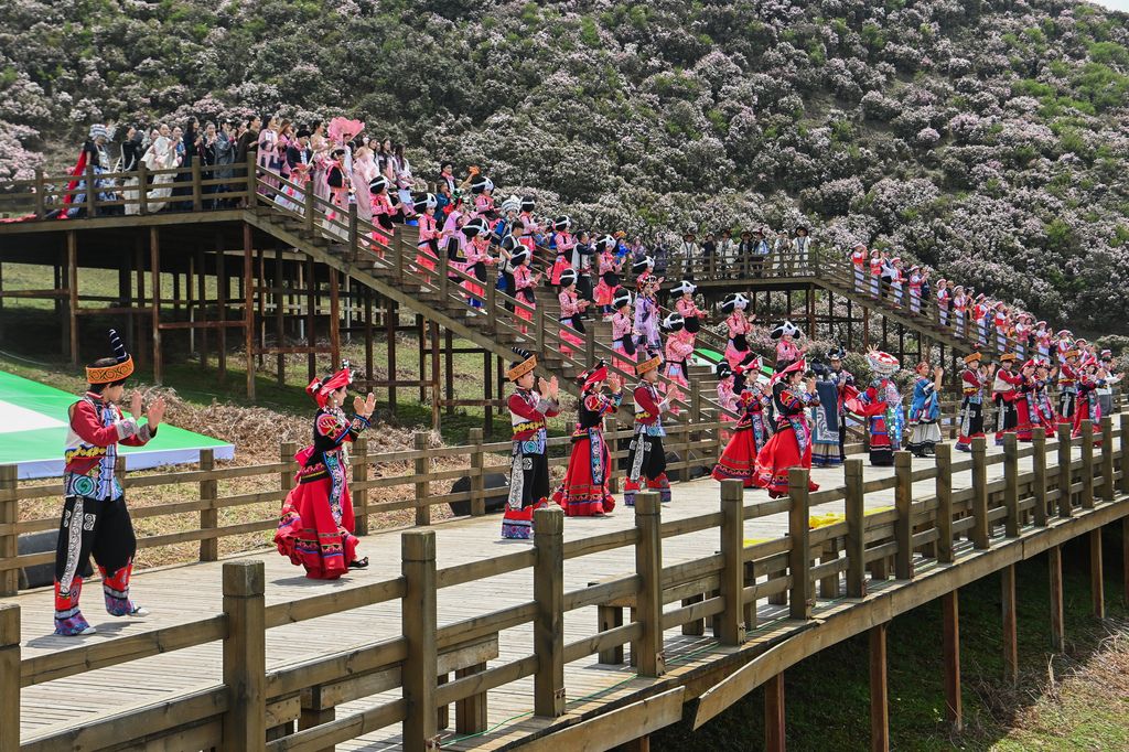 贵州省六盘水市盘州市乌蒙大草原景区,一场以花为媒、以衣为介的“乌蒙村秀”在四万亩竞相绽放的高山矮杜鹃花海中精彩上演。花海中的木栈道化身天然T台,模特们与当地百姓一起身着民族盛装,行走于花海栈道。彝族、苗族、白族、布依族、侗族五大民族服饰共同演绎非遗传统与现代时尚的碰撞,结合自然景观呈现出精彩纷呈的民族文化与生态旅游深度融合的视觉盛宴。