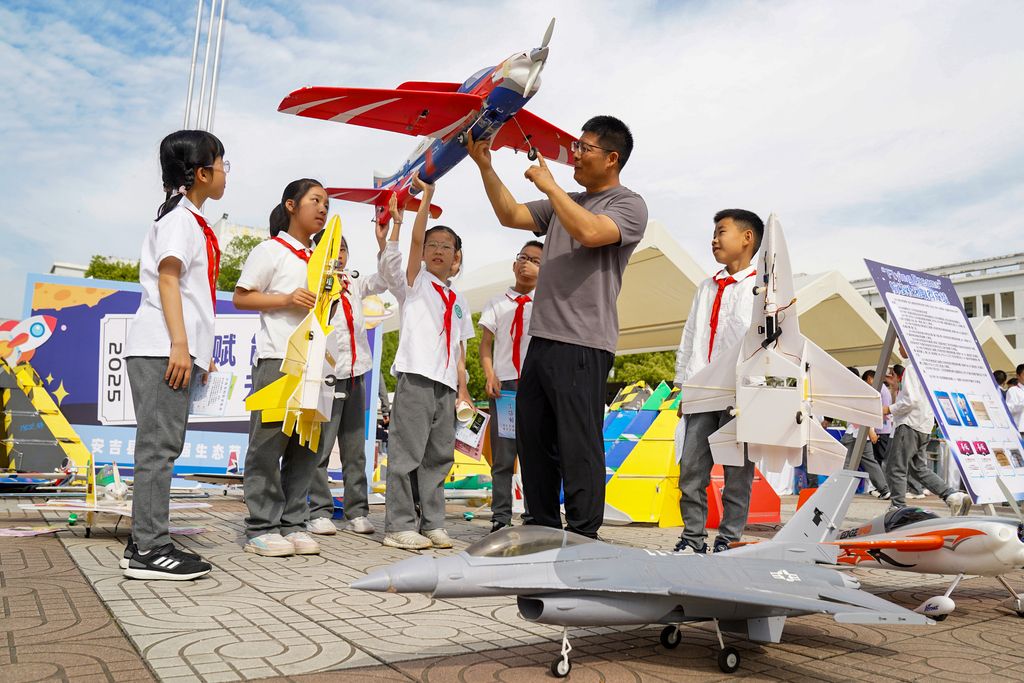 2025年4月24日,浙江湖州安吉县外国语学校举办以“科技成就未来 劳动创造美好”为主题的校园科技节。科学老师为学生们讲解航空航天科普知识,开展多样的主题活动,激发科学探索热情,启航未来的航天梦想。图为现场同学们在“航天飞行器”模型前观摩。