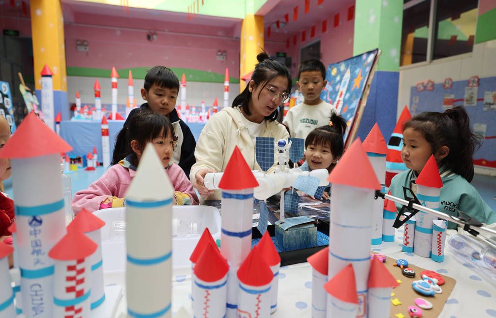 2025年4月24日,山东省临沂市沂南县孙祖镇中心幼儿园,孩子们在老师的带领下制作航天器模型。