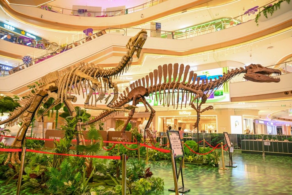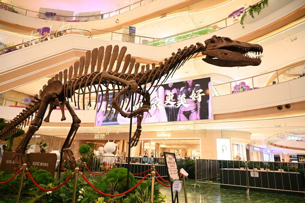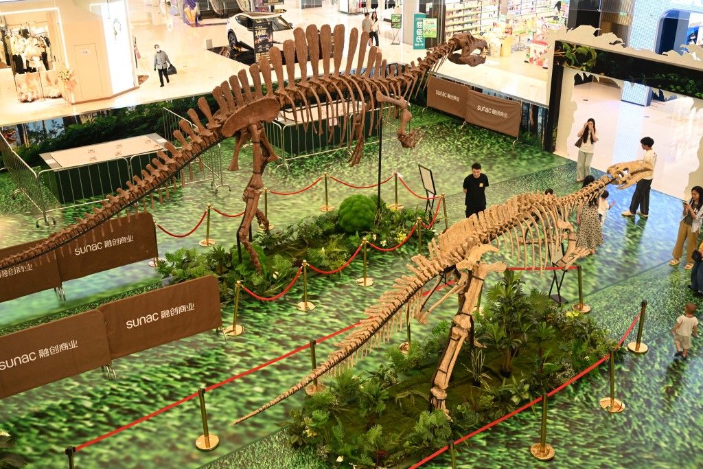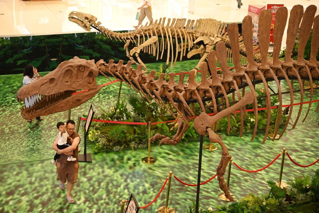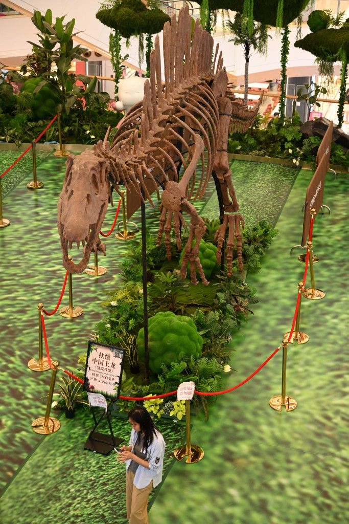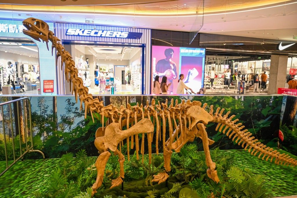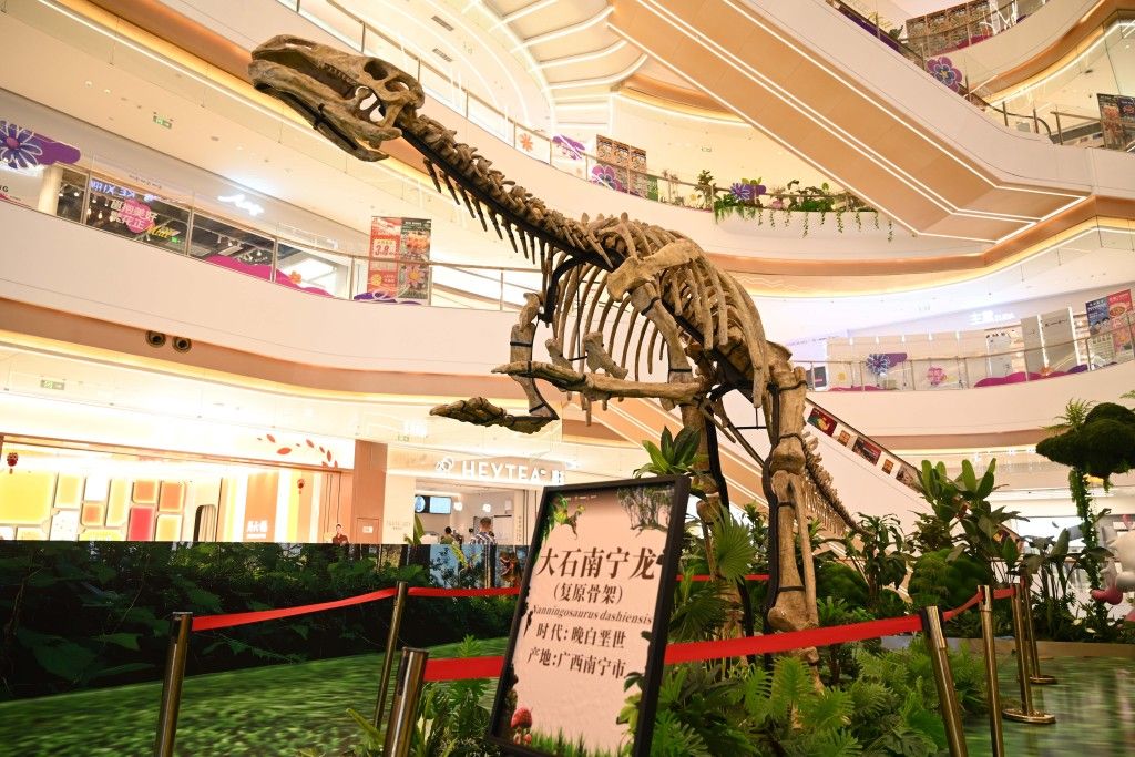2025年4月23日,广西壮族自治区南宁市,“远古恐龙”闪现一家大型商场,观众近距离欣赏恐龙复原骨架。