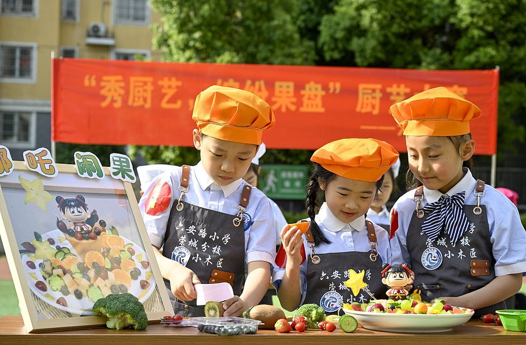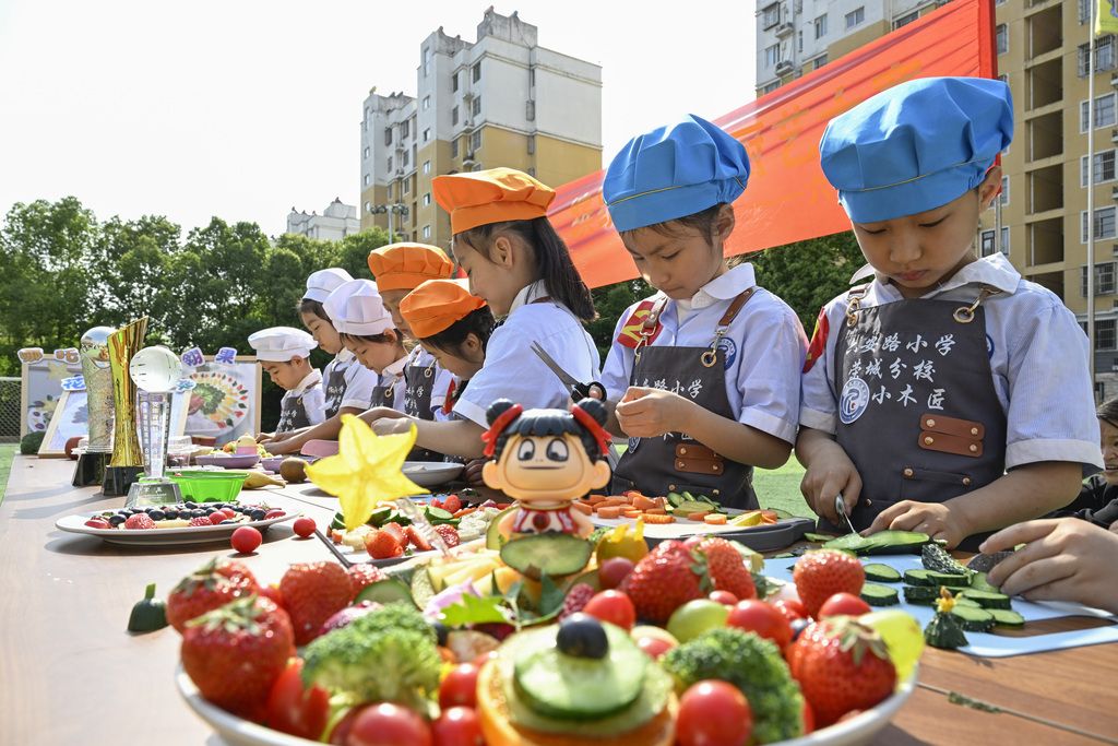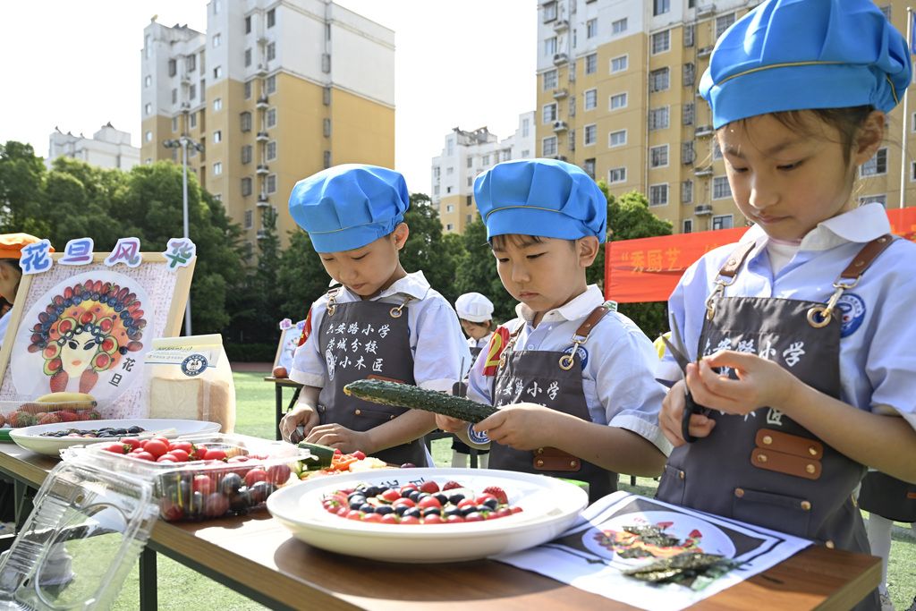 2025年4月25日,在安徽省合肥市庐阳区林店街道六安路小学荣城花园分校,小学生正在创作蔬菜水果拼盘。当日,该校开展“秀厨艺,缤纷果盘”劳动特色教育课。学生们通过现场将蔬菜、水果的组合搭配,创造出具有艺术气息的果蔬拼盘,旨在陶冶学生的生活情趣,培养爱生活、爱劳动的热情和锻炼生活自理能力。