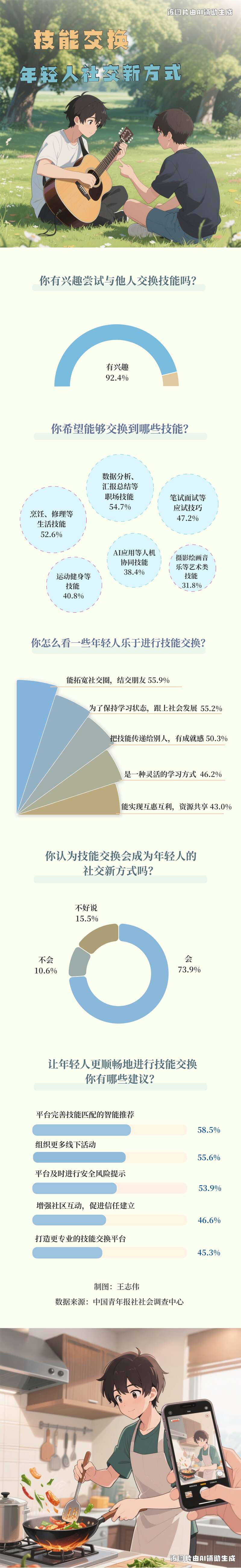 “免费交换技能,谁来?”“想找一位技能交换搭子”……技能交换让年轻人解锁社交新方式。中国青年报社社会调查中心的一项调查显示,73.9%的受访青年认为技能交换会成为年轻人的社交新方式。进一步分析发现,00后受访者对此认可度更高,为81.4%,其次是95后(79.1%)。汇报总结等职场技能(54.7%),以及烹饪、修理等生活技能(52.6%)是受访青年更想交换到的技能,获选率均超过半数。你希望与人交换哪些技能?
