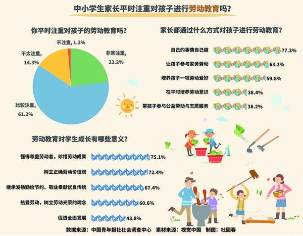 中国青年报社社会调查中心对1603名中小学生家长进行的一项调查显示,84.4%的受访家长平时注重对孩子进行劳动教育。77.3%的受访家长会让孩子自己的事情自己做。进行劳动教育,75.1%的受访家长认为孩子会懂得尊重劳动者,珍惜劳动成果,67.4%的受访家长认为能继承发扬勤俭节约、敬业奉献优良传统。