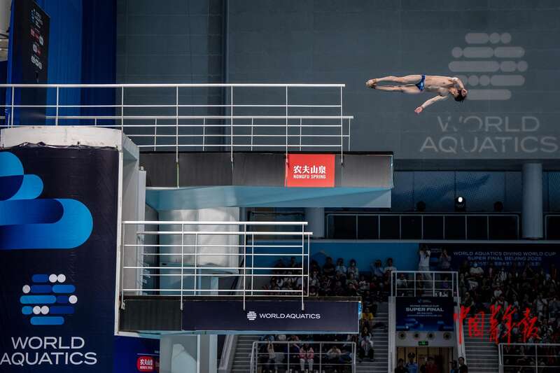 5月4日,北京,中国选手朱子锋在男单10米台比赛中。当日,2025年世界泳联跳水世界杯总决赛在北京国家游泳中心“水立方”落幕,中国跳水队包揽北京站总决赛全部9枚金牌。在前两站墨西哥瓜达拉哈拉站和加拿大温莎站中,中国队分获7金和8金。中青报·中青网记者 李隽辉/摄