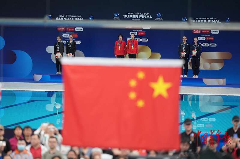 5月2日,北京,2025年世界泳联跳水世界杯总决赛,中国队陈芋汐(左四)和全红婵(左三)在女双10米台比赛中以绝对优势夺得冠军。中青报·中青网记者 李隽辉/摄