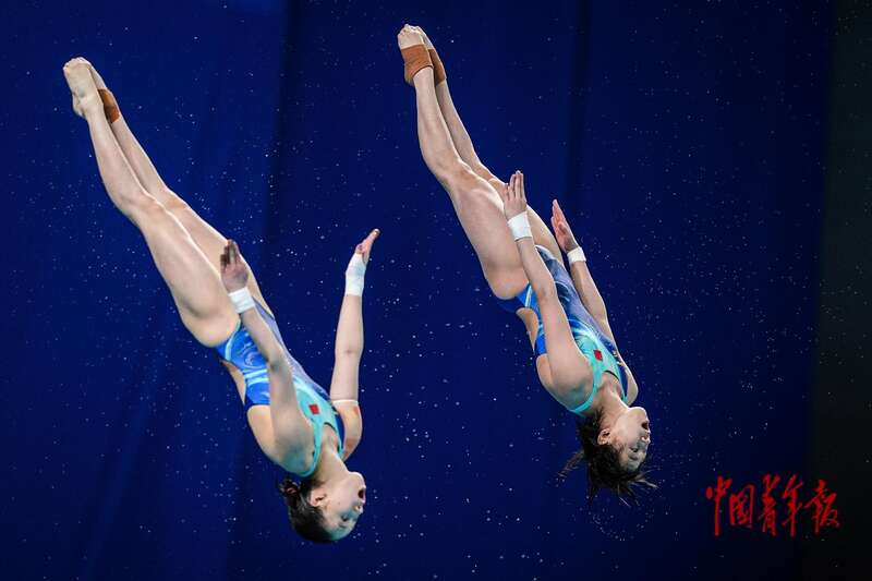 5月2日,北京,2025年世界泳联跳水世界杯总决赛,中国队陈芋汐(左)和全红婵在女双10米台比赛中。中青报·中青网记者 李隽辉/摄