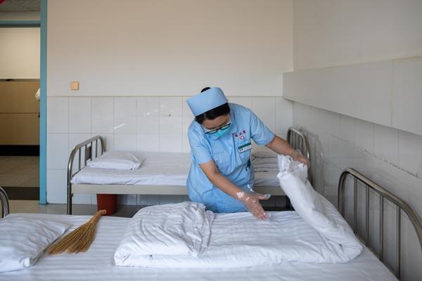 5月8日,一名精神科病房护士正在为患者整理床铺,检查是否存在危险品。