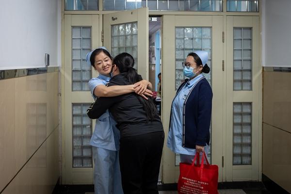 5月9日,黑龙江北安,黑龙江省第三医院北安院区,一名精神科患者出院,含泪在病房门口与护士拥抱告别。