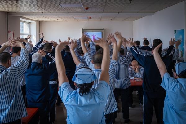 5月9日,在精神科病区,护士们带领患者一块儿活动身体。