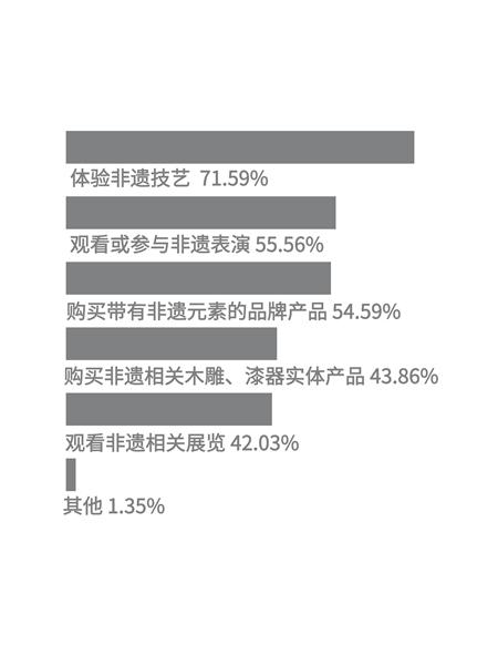 除了新生代的非遗代表性传承人,越来越多的青年人也在以各种形式体验或学习非遗技艺。中青校媒调查发现,受访者消费非遗产品或服务的场景较为多元,包括体验非遗技艺(71.59%),观看或参与非遗表演(55.56%),购买带有非遗元素的品牌产品(54.59%),购买非遗相关木雕、漆器实体产品(43.86%),以及观看非遗展览(42.03%)等。