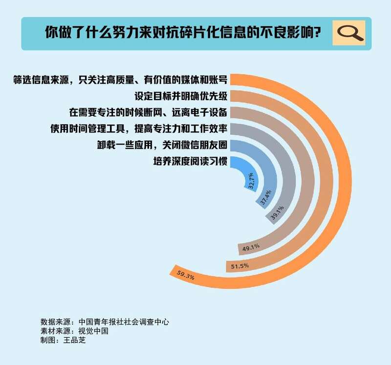对抗碎片化信息的不良影响,59.3%的受访者建议筛选信息来源,关注高质量、有价值的媒体和账号;51.5%的受访者建议设定目标并明确优先级,确保重要任务不受碎片化信息干扰;49.1%的受访者提出在需要专注的时候断网、远离电子设备;39.1%的受访者建议使用时间管理工具,提高专注力和工作效率;37.4%的受访者建议卸载一些应用,关闭微信朋友圈;32.7%的受访者建议培养深度阅读习惯,选择书籍或长篇文章进行深入学习;11.4%的受访者建议更多地参与线下活动。
