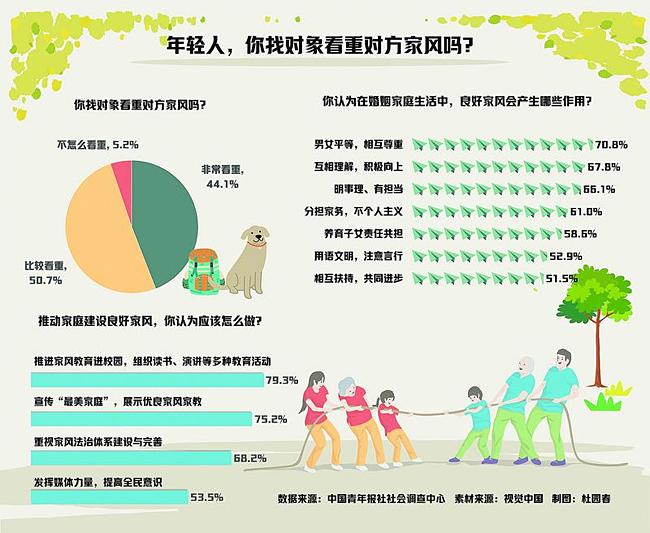 调查中,94.8%的受访青年明确表示,找对象看重对方家风,44.1%的受访青年直言非常看重。